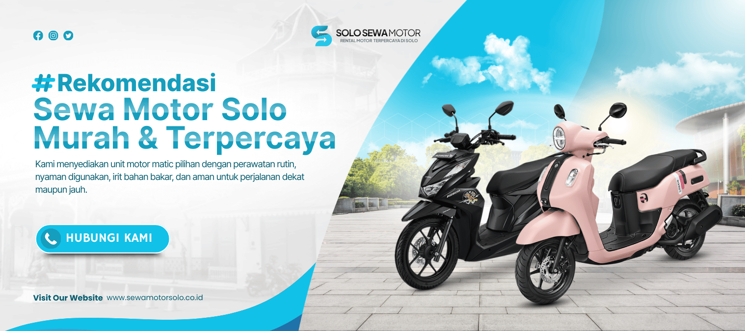 Berlokasi strategis di pusat kota Solo, Solo Sewa Motor menjadi solusi praktis bagi wisatawan, mahasiswa, pekerja, hingga warga lokal yang membutuhkan kendaraan nyaman, irit, dan mudah digunakan. Seluruh unit kami dirawat secara berkala untuk memastikan keamanan dan kenyamanan selama berkendara.